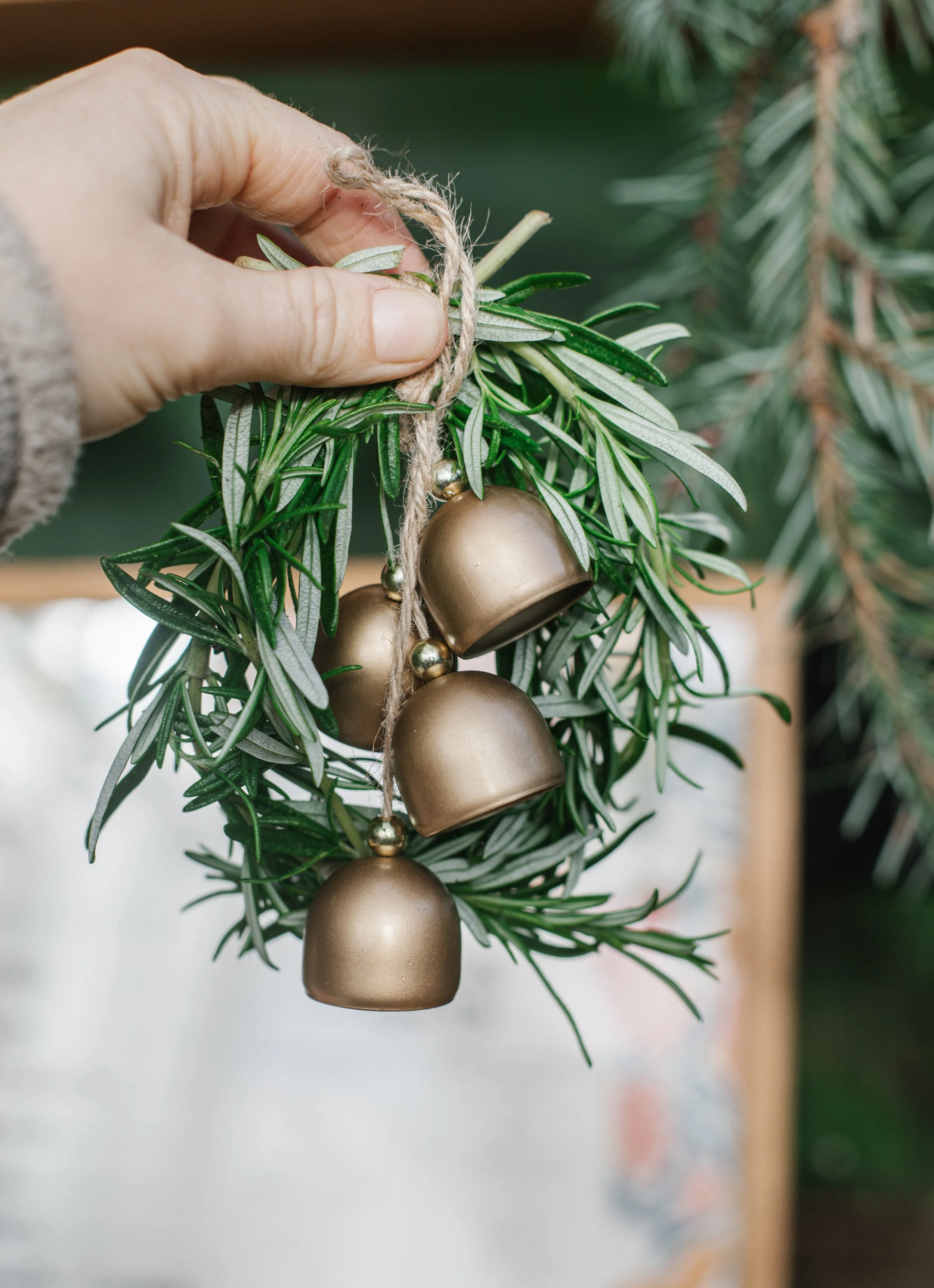 Thread a bit of twine or ribbon through the ornament’s loop and tie it onto the top or bottom of the wreath. If the ornament is heavier, anchor it to the wire frame instead of the rosemary itself. This tiny detail brings personality and makes your wreath feel festive and thoughtful.